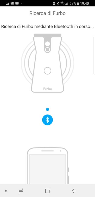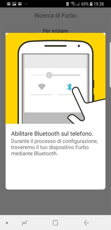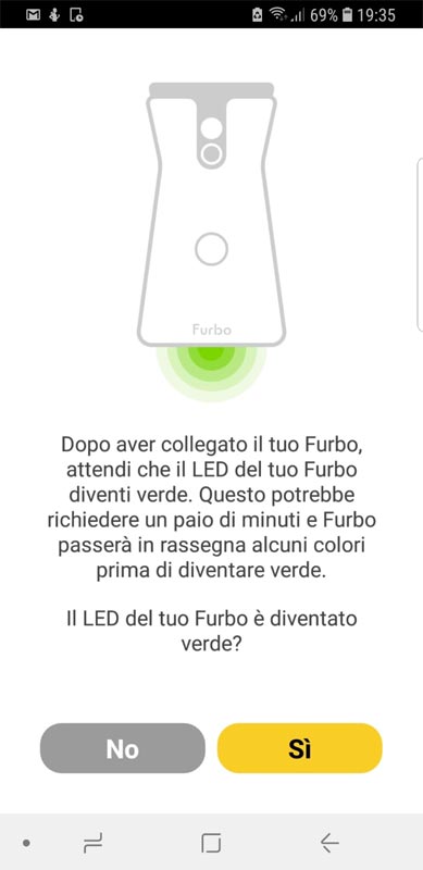 3. Avvia l’APP ed attendi che il led presente alla base di FURBO diventi verde. Potrebbe metterci un paio di minuti, appena la luce diventa verde premere su “si”.